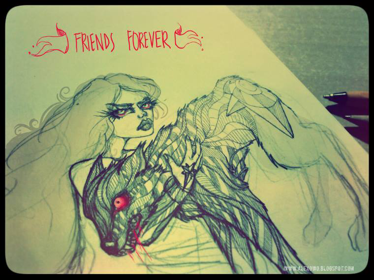 Z racji wszechogarniającego mnie szczęścia jaki dają mi dwa dni wolnego, zwanego inaczej weekendem, mogę nareszcie się tutaj pokazać z czymś nowym (i starym) :F Nowy jest rysunek 'czerwony', inspirowany tak bardzo aktualną teraz aurą świąt.. (żarcik), nabazgrany dla rozrysowania się przed czymś bardziej 'ambitnym' co dopiero siedzi w głowie.. A stary obraz na dole (i oto właśnie pojawia się niespodziewanka) jest obrazem, który już znacie, jednak poddałam go małemu tuningowi, oraz przeznaczyłam na konkurs dla Was :D Pomyślałam, że byłoby ciekawie, bo dawno już niczego nie organizowałam. Sposób jest inny niż kiedyś -czekam na najciekawszą interpretację którejś mojej pracy, pracy którą lubicie, lub która Wam utkwiła najbardziej w głowie.. może być to jakaś stara praca wygrzebana z dna mojego bloga/deviantarta.. :) Najfajniesza i najciekawsza interpretacja jakiejkolwiek mojej pracy (nie ma znaczenia ilość zdań) przesłana na mejla: alexowo@interia.pl wygra obraz (30cm x 40cm )''CoffeeTime''. Czas start - koniec 31.12.2013